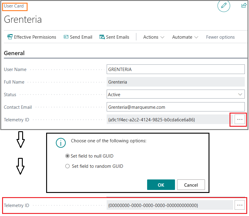 Desde la ficha del usuario clicamos el botón de 3 puntos al lado del ID de telemetría, y seleccionamos la opción de establecer el campo con GUID nulo. De esta manera vemos que el ID de telemetría sería un valor con todos los números cero.