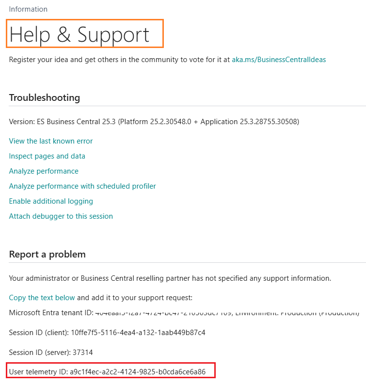 Another way to find it is on the help and support page (Ctrl+Shift+F1), at the bottom in the report a problem section, we find the tenant information, sessions and the user telemetry ID.