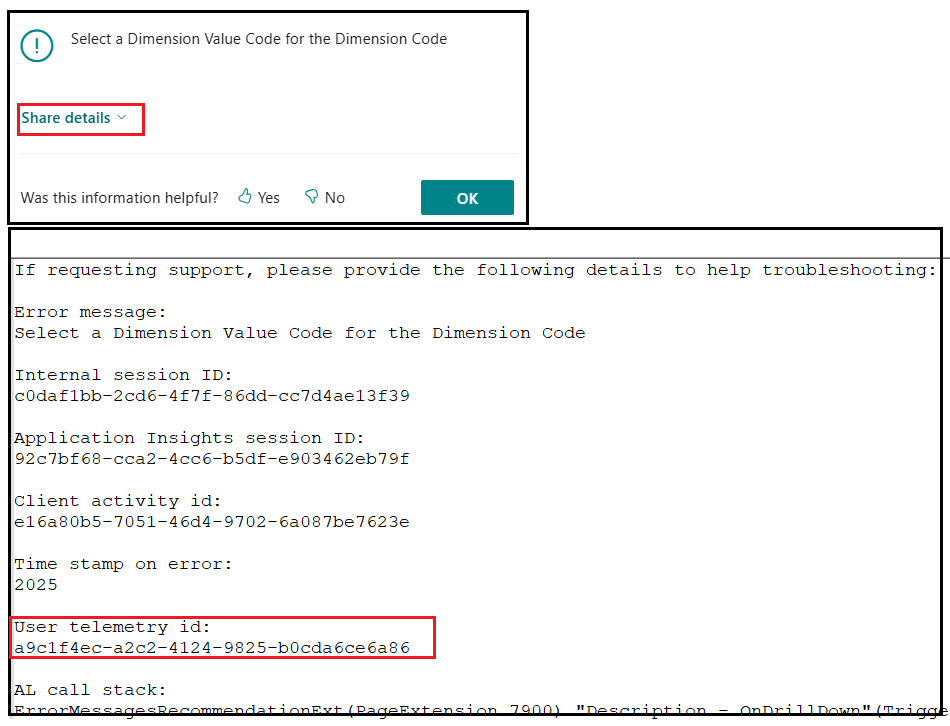 It is important to identify that also when we see an error message, we have the possibility to obtain more details about it, copy it and share it. Share error details to get help from another user | Microsoft Learn