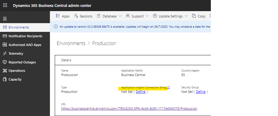 - Select the relevant environment in the Business Central administration center, and then select Application Insights Connection String from the main menu.
