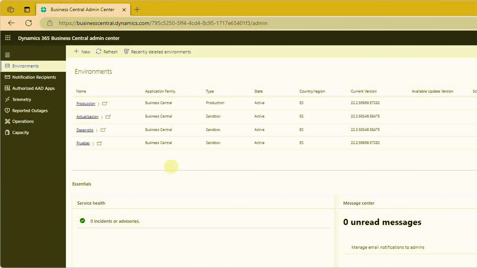 This screen offers us multiple tabs each with configuration options necessary to manage the tenant and their respective environments, we have support contacts, notifications, telemetry values, service outage information, a record of the operations carried out in each environment and the control of the capacities of the environments.