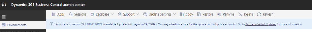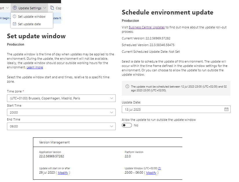 In the update settings option (we can access these options in the same way from the «Version Management» section of the environment), we find the configuration options for an attention window for updates, and if there is an update version available, the date corresponding to the update. Managing Updates in the Admin Center – Business Central | Microsoft Learn