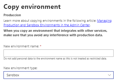 La opción de Copiar, permite copiar desde un ambiente cualquiera a otro. Siempre respetando la cantidad de ambientes de producción y sandbox. Hemos de colocar el nombre y el tipo de ambiente destino. Copy an environment – Business Central | Microsoft Learn