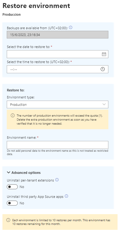 La opción de Restaurar, permite restaurar cualquier tipo de ambiente a una determinada fecha y hora (30 días antes), indicando el tipo de ambiente para restaurar y su nombre, además de configurar si deseas mantener extensiones propios o de terceros. (como máximo 10 restauraciones al mes) Restoring an Environment in the Admin Center – Business Central | Microsoft Learn