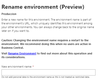 La opción de Renombrar, permite cambiar el nombre de un ambiente existente, tener en cuenta las consideraciones correspondientes de no hacerlo cuando esté en uso, o de entregar las nuevas URL de servicios web, si es que otros aplicativos vienen usándolas. Rename Environments in the Admin Center – Business Central | Microsoft Learn