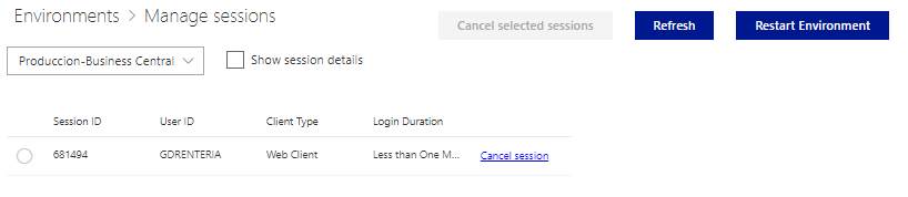 The Sessions option displays the active sessions in the environment, of the type web client, background, mobile and others. Individual and group cancellation of sessions is allowed, as well as an important option to restart the environment. Managing Sessions in the Admin Center – Business Central | Microsoft Learn