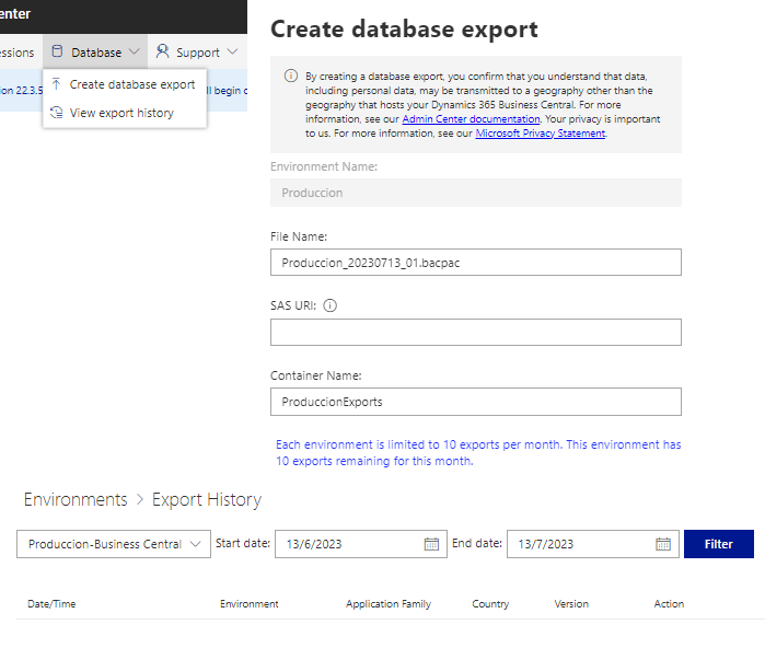 En la opción Base de datos, tenemos la opción de exportar una copia de seguridad bajo el formato de bacpac (como máximo 10 exportaciones al mes) para lo cual debemos contar con una cuenta de Azure Storage previamente. Exporting Databases in the Admin Center – Business Central | Microsoft Learn