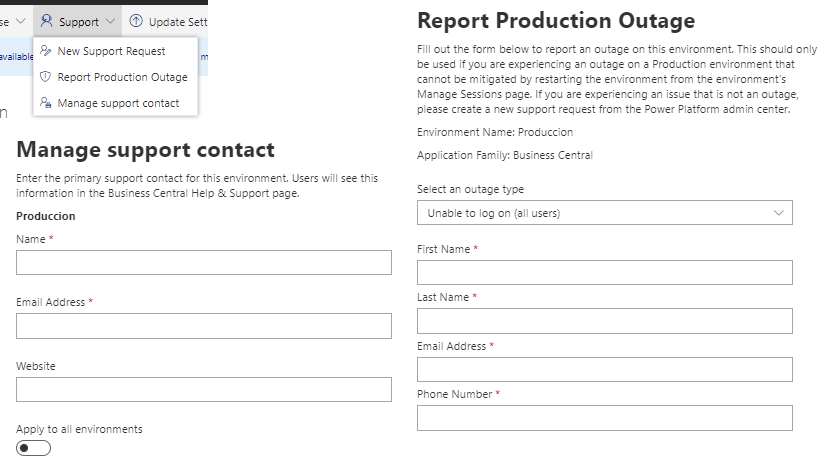 En la opción de Soporte, se encuentra la opción de generar un requerimieno de nueva atención de soporte, si el problema es una interrupción del servicio de producción (únicamente), primero debemos agotar todas las vías posibles incluyendo un reinicio de ambiente, si aún no se habilita el ambiente, procedemos a crear un reporte de interrupción. Managing technical support – Business Central | Microsoft Learn