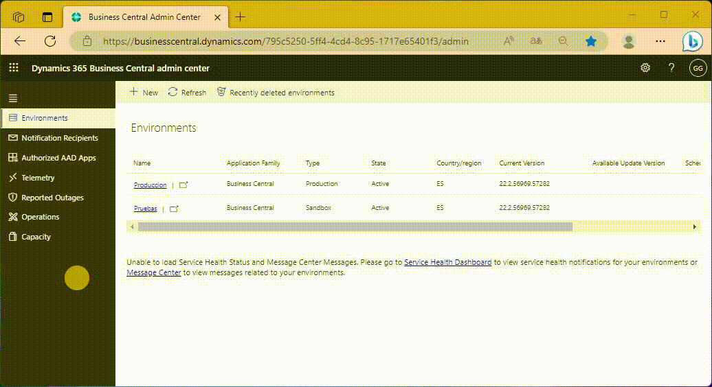 El URL para ingresar al área de Administración de BC es el siguiente: https://businesscentral.dynamics.com/»TENANT_ID»/admin