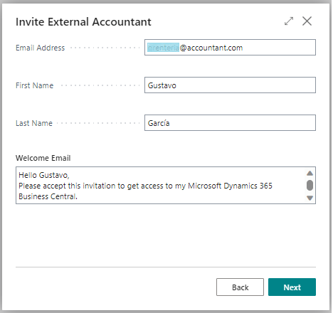 You must complete the basic full name and email information. The accountant’s email address must be a work address based on Azure Active Directory. If the accountant uses another type of email, the invitation cannot be sent. The body of the email to be sent is also displayed in case you wish to change it.