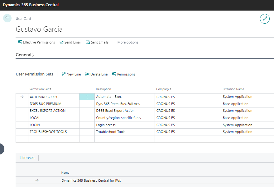 Ahora nos toca darle los permisos adecuados y deseados para ejercer sus labores. Estas licencias proporcionan los mismos derechos de uso que las licencias Business Central asignadas, excepto el acceso a la configuración de usuarios o a tareas administrativas.