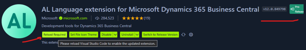 Cuando se instala una nueva versión de AL se te solicitará recargar VSC.