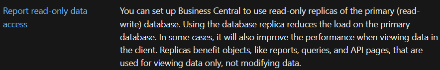 Como superusuario o administrador, se puede cambiar la intención de acceso a la base de datos en reportes, páginas del tipo API y Queries para mejorar el rendimiento del servicio. Manage database access intent in Business Central – Business Central | Microsoft Learn