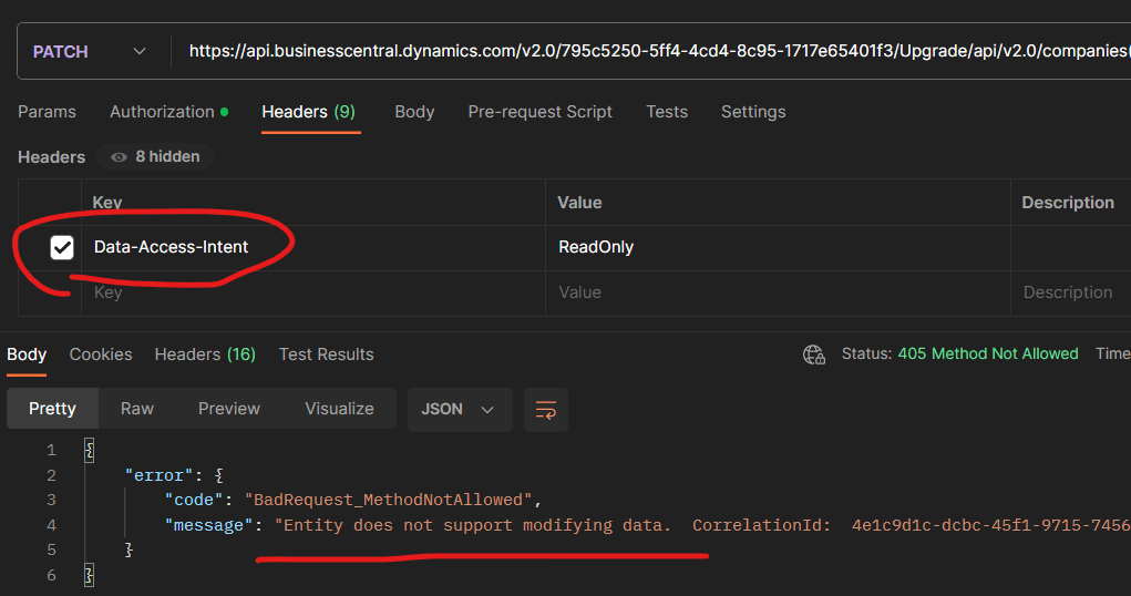 Es posible también configurar el valor de Data-Access-Intent en la llamada OData, como vemos a continuación en la imagen de un ejemplo en el cual se desea realizar una modificación de los datos de un empleado vía API, el mensaje es claro e indica que No permite la modificación de datos.
