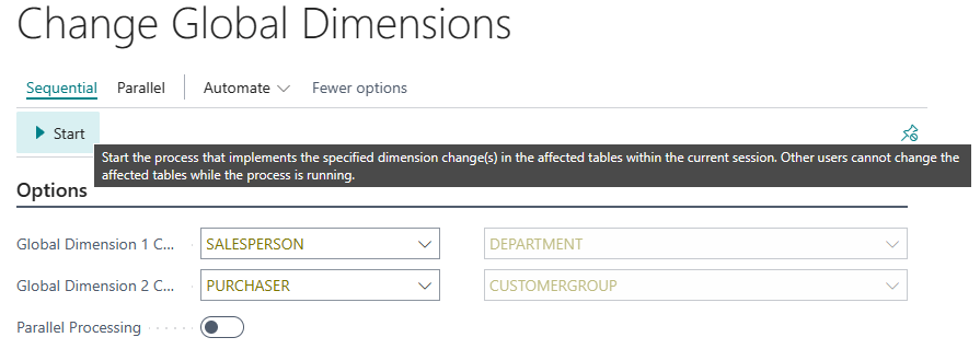 If you need to change the global dimensions, we have a process that allows you to change them, but this operation could take a long time, affect performance, and lock the tables during the update. To change global dimensions