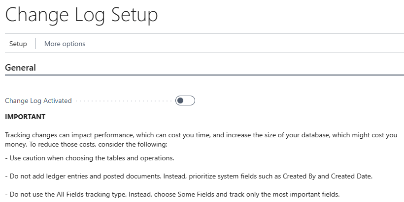 Business Central nos recomienda no añadir tablas históricas ni de movimiento, así como también evitar realizar el seguimiento de todos los campos de la tabla, sino que decidamos que campos nos interesa, ya que esto impacta incrementando la cantidad de veces que se escribe en la base de datos.