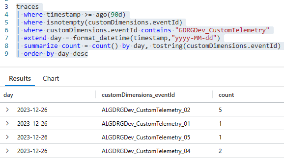 Once we have custom telemetry information collected by the Application Insights service, we can analyze it by different tools. For example Power BI or KQL as we see below.