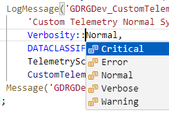 Session.LogMessage(EventId: Text, Message: Text, Verbosity: Verbosity, DataClassification: DataClassification, TelemetryScope: TelemetryScope, CustomDimensions: Dictionary of [Text, Text]) - Dimension overloads