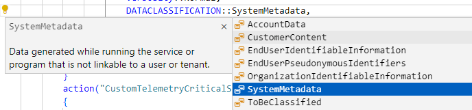 An event is also made with the DataClassification parameter other than SystemMetaData and as indicated above, this event is not collected in the Application Insights service for privacy reasons.