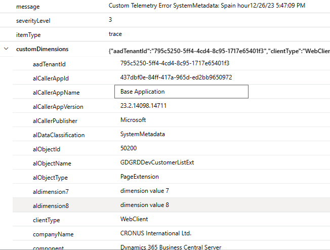 We also have information about the tenant, the extension and version that emits the event, the environment and type of environment, as well as the name of the company. Here the information of all custom dimensions by default. Default CustomDimensions