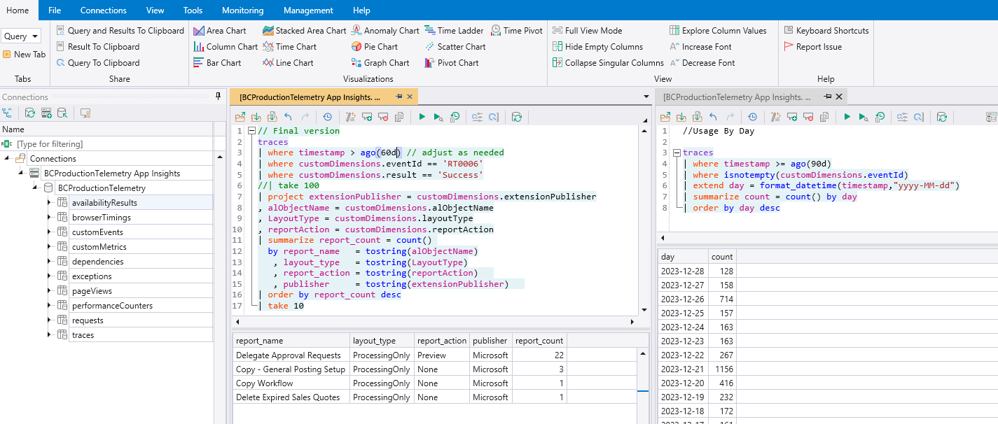 In the following link we have a tutorial that will guide us to create a kusto query (KQL) to analyze how users use reports in a Business Central environment.
