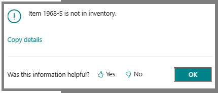 Error messages generated by calls to the Error(String) and Error(ErrorInfo) methods have voting functionality. A yes or no question about whether the message was helpful when a user receives an error message in Business Central.