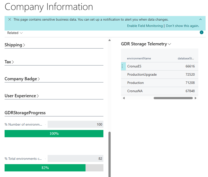 When the job queues have been executed successfully, we will go to the company information page, and we will see a new FactBox that shows us the values of the environments and their storage capacities used in KB. In addition to a couple of progress bars that visually indicate the use of the 4 environments available in the tenant, and in percentage the consumption of the current capacity in relation to the total capacity. For the progress bar I used an add-in that you can find here: