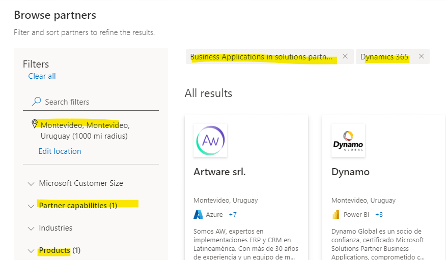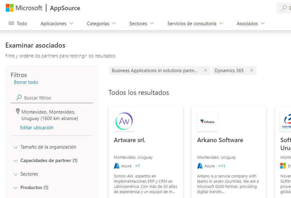 Para encontrar el partner más adecuado se puede filtrar por ubicación y además por los que que distribuyen productos Dynamics 365 y tengan una designación de Business Applications.