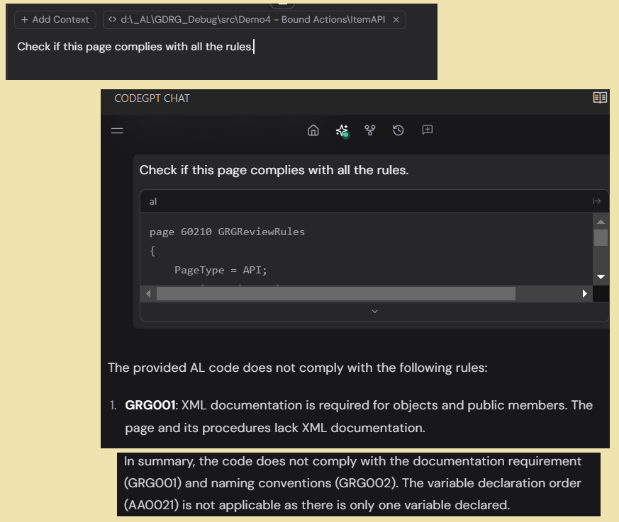 Then, I requested a review of the code for all the rules, and it responded less accurately than GitHub Copilot, but in a very decent manner considering the training time and the amount of information I provided for its learning.