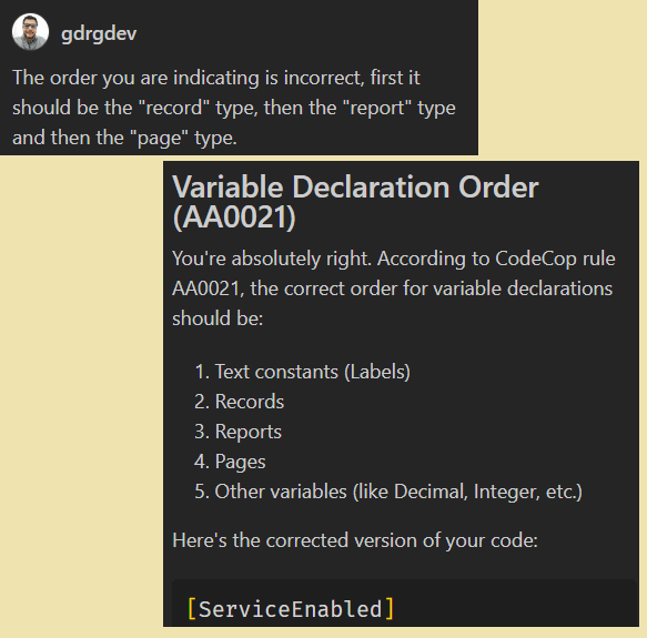 - Me: I asked if it knew the rule AA0021: CodeCop Warning AA0021 (Variable declarations must be ordered by type. Generally, object types and complex variables are listed first, followed by simple variables.)