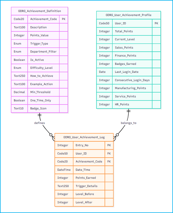 - Table 50102 – GDRG User Achievement Log: Historical record of all achievements obtained by each user with timestamps.