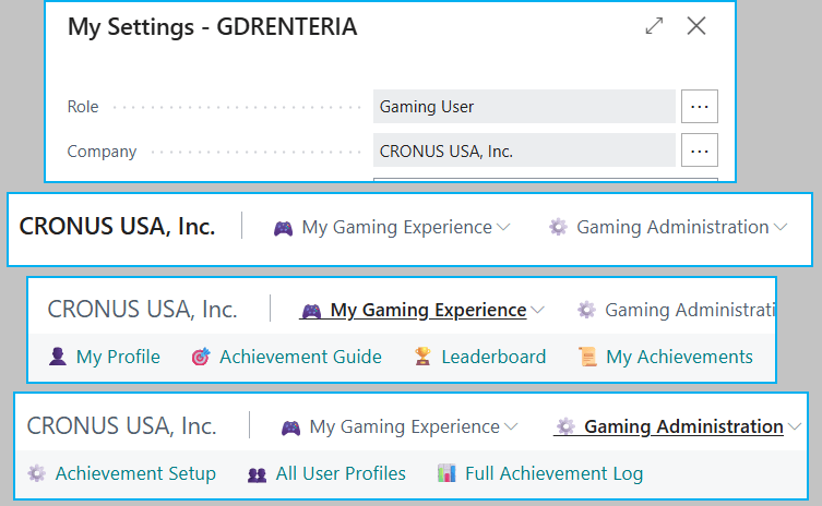 - Page 50100 – GDRG Gaming Dashboard: Main gamification panel with personal summary and quick access. Role Center Page.