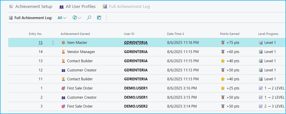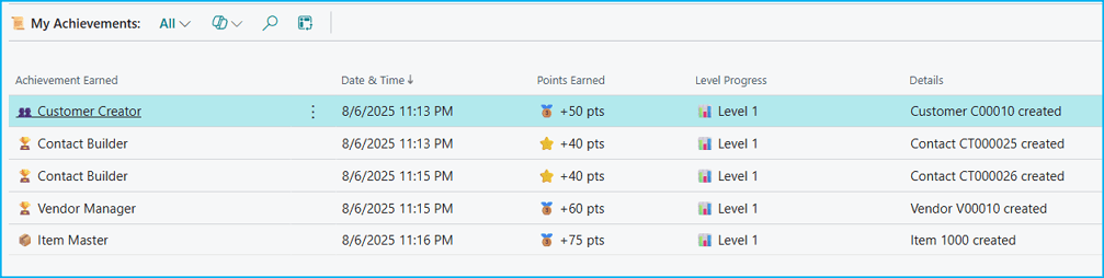 - Codeunit 50100 – GDRG Achievement Processor: Main processing engine that evaluates actions and automatically grants achievements.