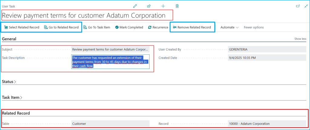Creamos una tarea «Review payment terms for customer Adatum Corporation» y lo relacionamos al Customer No. 10000 (Adatum Corporation) . El botón «Go to Related Record» te lleva directamente al Customer Card correspondiente.