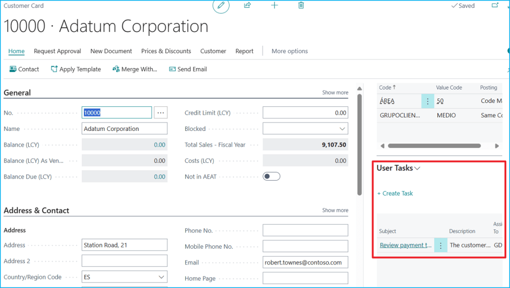 En la siguiente imagen vemos que estamos en el Customer Card de «10000 – Adatum Corporation» y en la parte derecha tienes el FactBox «User Tasks».