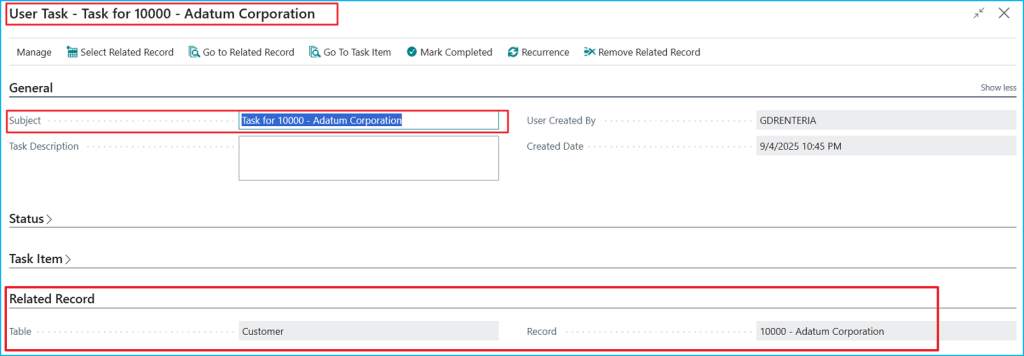 To achieve this goal, as we can see in the following image, the task is no longer «alone,» but rather connected to a record. The key to this is the «Related Record» section at the bottom of the page.