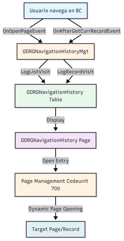 - GDRGNavigationHistoryMgt.Codeunit.al: Event subscribers y lógica de registro.