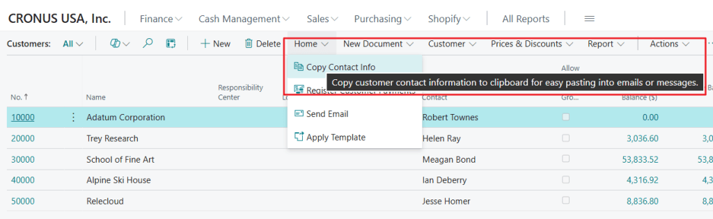 Example: We navigate to the Customer List, Vendor List, or Customer Ledger Entries page. We select a record and find the new «Copy Contact Information» action in the menu.