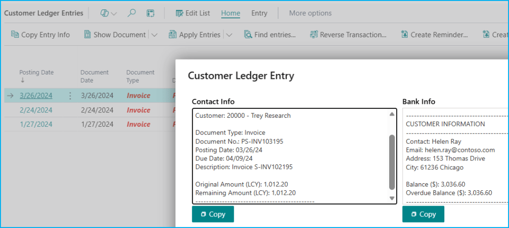 Here’s another example, taken from the customer ledger entry page. We’ve copied information from a transaction. The left column shows the transaction details, while the right column displays the complete customer information.