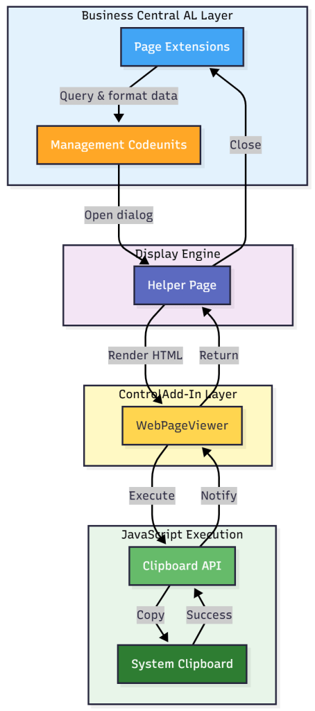 - Control Add-In Layer: WebPageViewer renders HTML with text areas, buttons, and JavaScript event handlers.