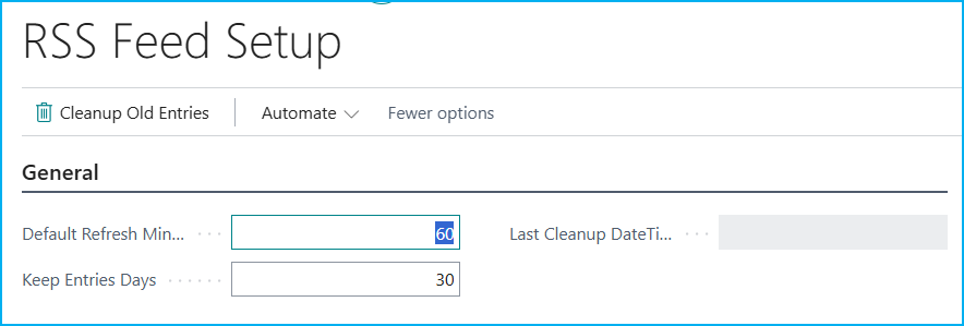The RSS Feed Reader module begins with a settings page where we define some default parameters. Here we set the automatic update interval (60 minutes by default) and the retention period for old entries (30 days). The «Cleanup Old Entries» action allows us to manually clear outdated entries.