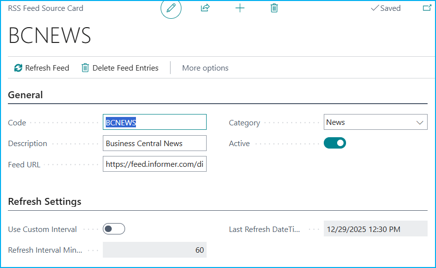 In the following screen, we see how to configure an RSS feed, in this case «Business Central News» (BCNEWS), where we define the unique code, description, feed URL, and a category (this value is very important). In «Refresh Settings» section: you can use the default interval mentioned earlier or activate a custom interval specific to this feed.
