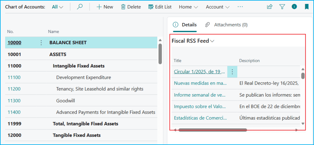El RSS Feed Reader se integra nativamente en cualquier página estándar de Business Central. En el siguiente ejemplo, en el Plan de Cuentas, el FactBox «Fiscal RSS Feed» muestra las entradas RSS filtradas por la categoría «Fiscal», mostrando automáticamente las noticias relevantes de fuentes como Agencia Tributaria o Banco de España mientras navegas.