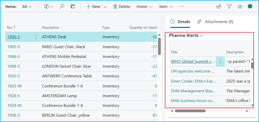 Otro ejemplo, sería en la lista de productos, el FactBox «Pharma Alerts» filtra automáticamente las entradas RSS de categoría «Pharma», mostrando noticias de fuentes como WHO y EMA (European Medicines Agency).