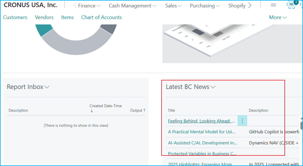 Otra integración muy útil es con un Role Center, como, el Role Center del Business Manager que incluye el componente «Latest BC News» que muestra las últimas entradas RSS. De esta manera, podríamos mantener a nuestro equipo informado con noticias actualizadas automáticamente sin salir de Business Central.