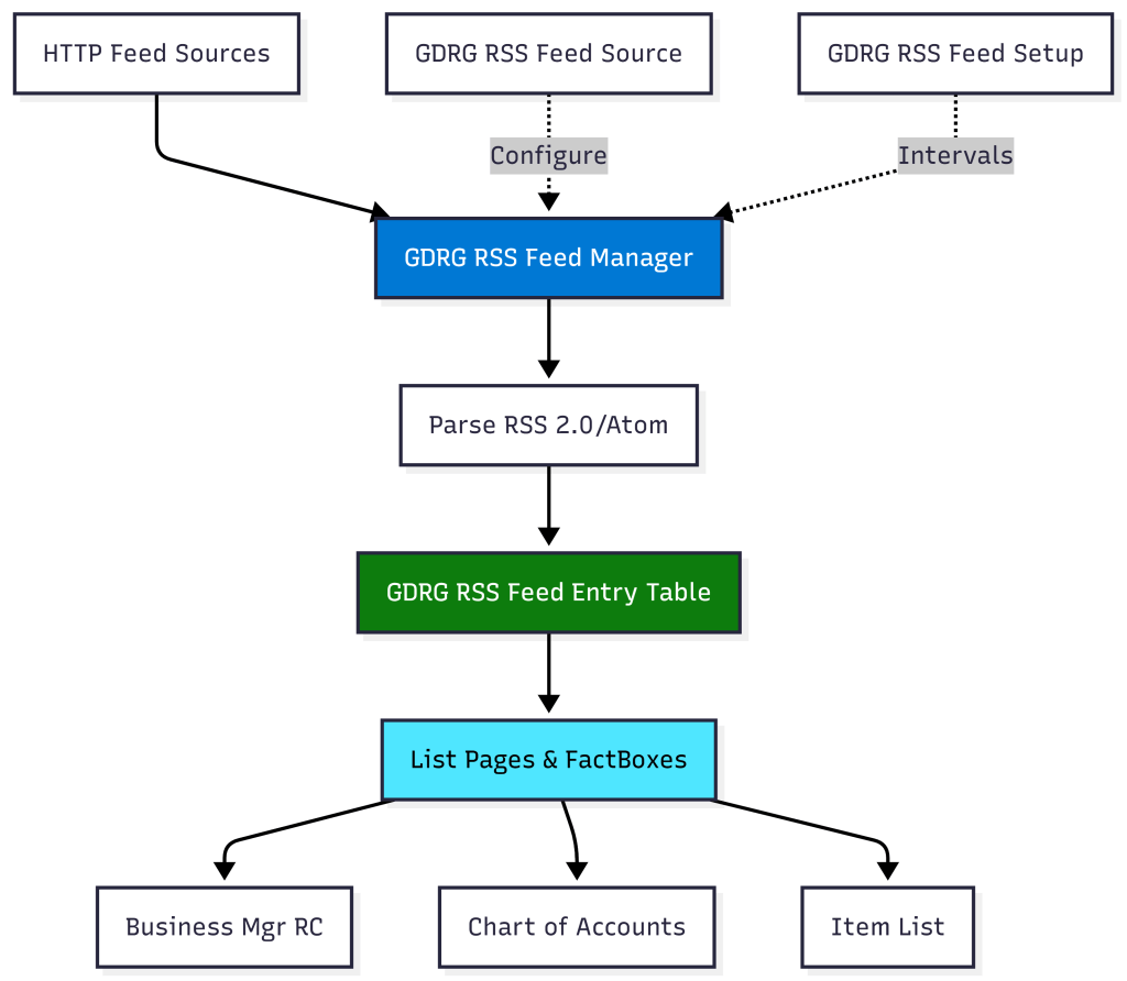 - Feed Management: A centralized codeunit handles the retrieval, parsing, and storage of RSS/Atom feeds.