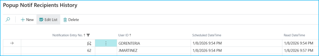 - Business Logic: A codeunit for distributing and tracking notifications.