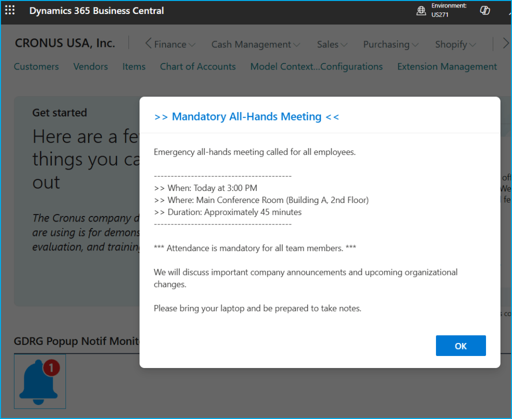 When the scheduled time arrives, the «GDRG Popup Notification Monitor» page (Add-in + timer) integrated with Role Center detects the pending notification. The JavaScript Add-in Control displays a centered window that blocks interaction with BC until the user clicks the OK button.
