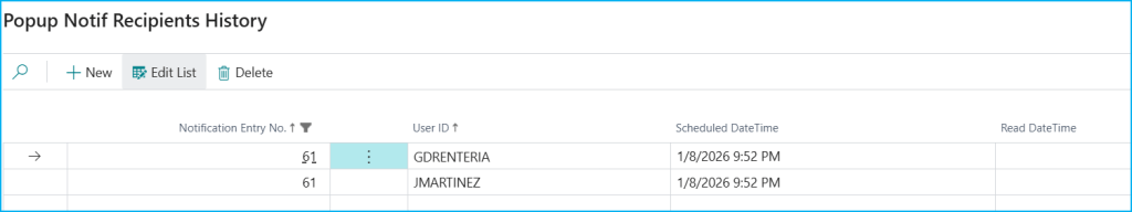 Once created, as mentioned, the notification is stored in the «Popup Notification Queue» table. From this list, you can manage existing notifications, view recipients using the «View Recipients» action, or delete selected notifications with «Delete Selected».