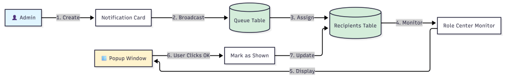 While exploring ways to enable this type of communication, I considered a popup notification system. Along the way, the idea evolved into a feature that broadcasts messages, tracks which users have read each notification, and integrates seamlessly with Role Center pages.